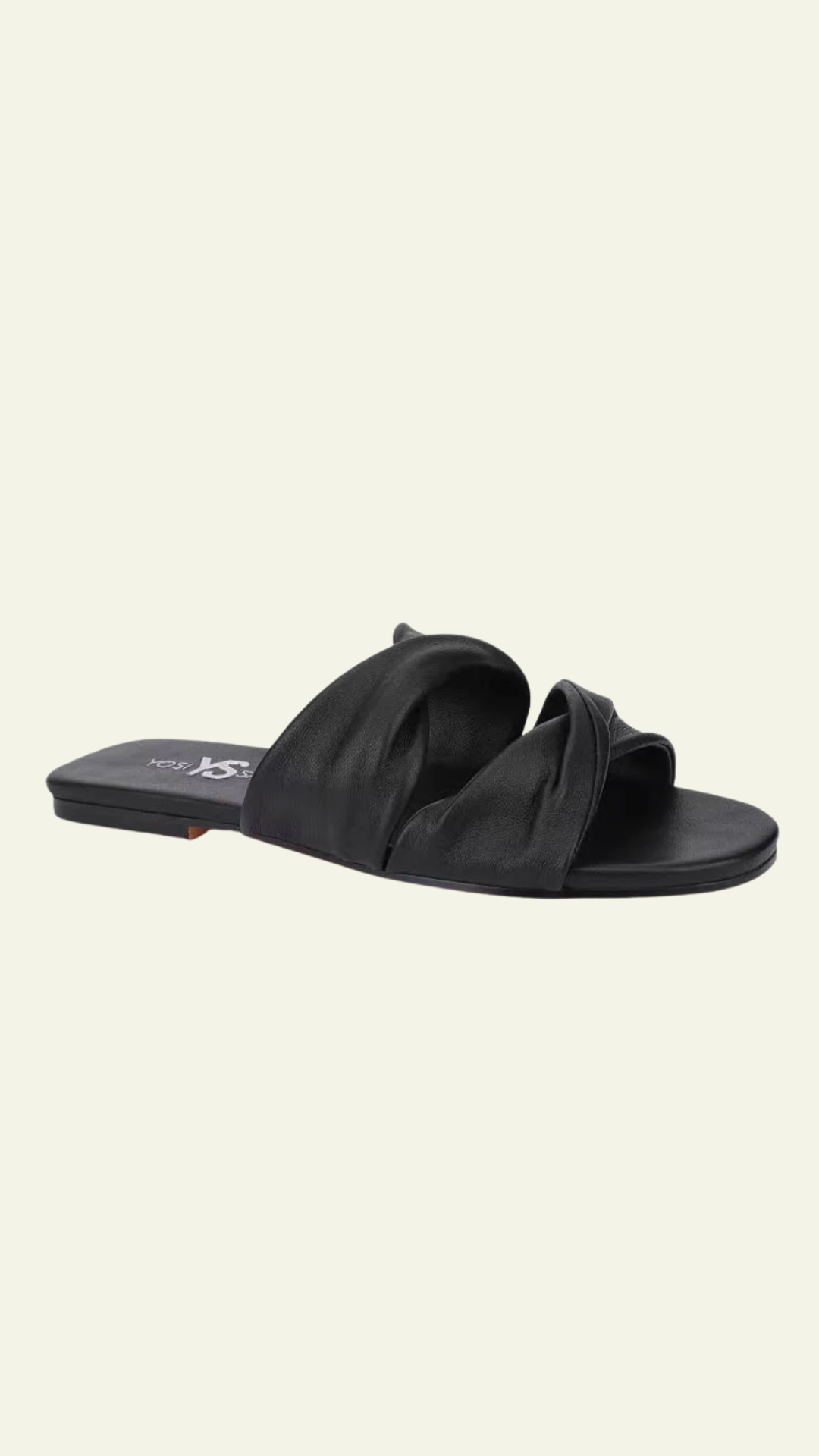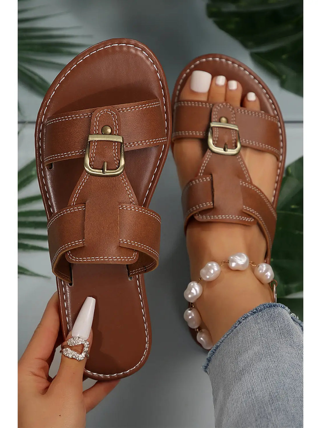 Buckle Decor Dual Bands Pu Leather Flat Slippers