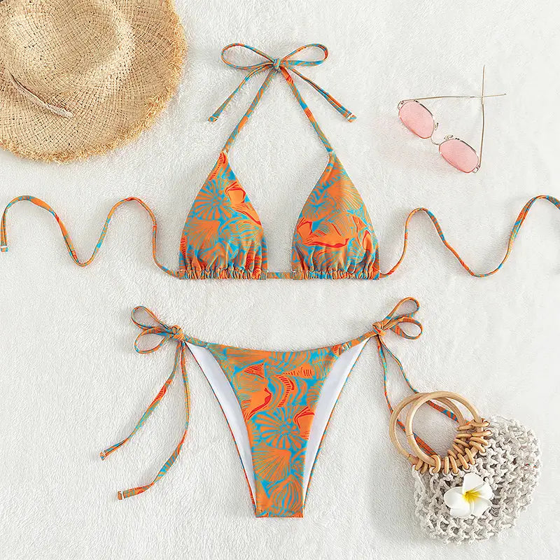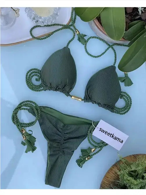 Solid Color Halter Micro Thong Triangle Bikini Set