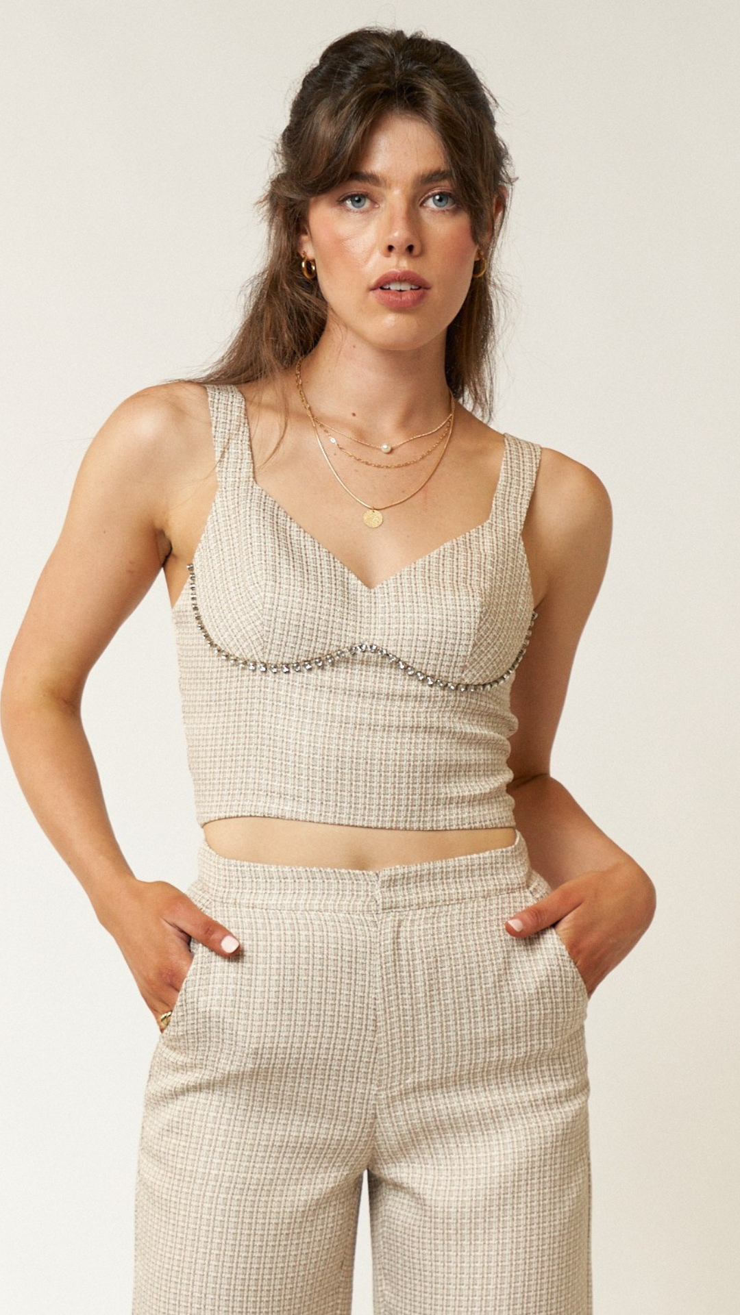 This beautiful Rhinestone Tweed Crop Top makes a fashion statement to any wardrobe. 100% poly...