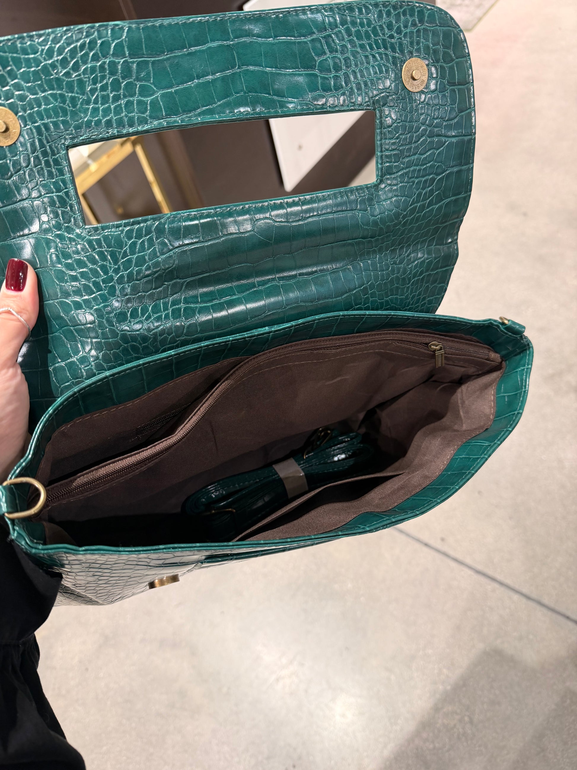 This crocodile print clutch is an elegant and practical accessory for any occasion. The textured print adds a touch of luxury, while the wrist strap allows for easy and secure carrying. A must-have for those looking to elevate their style with a touch of sophistication.