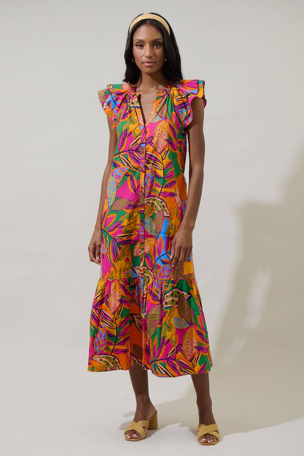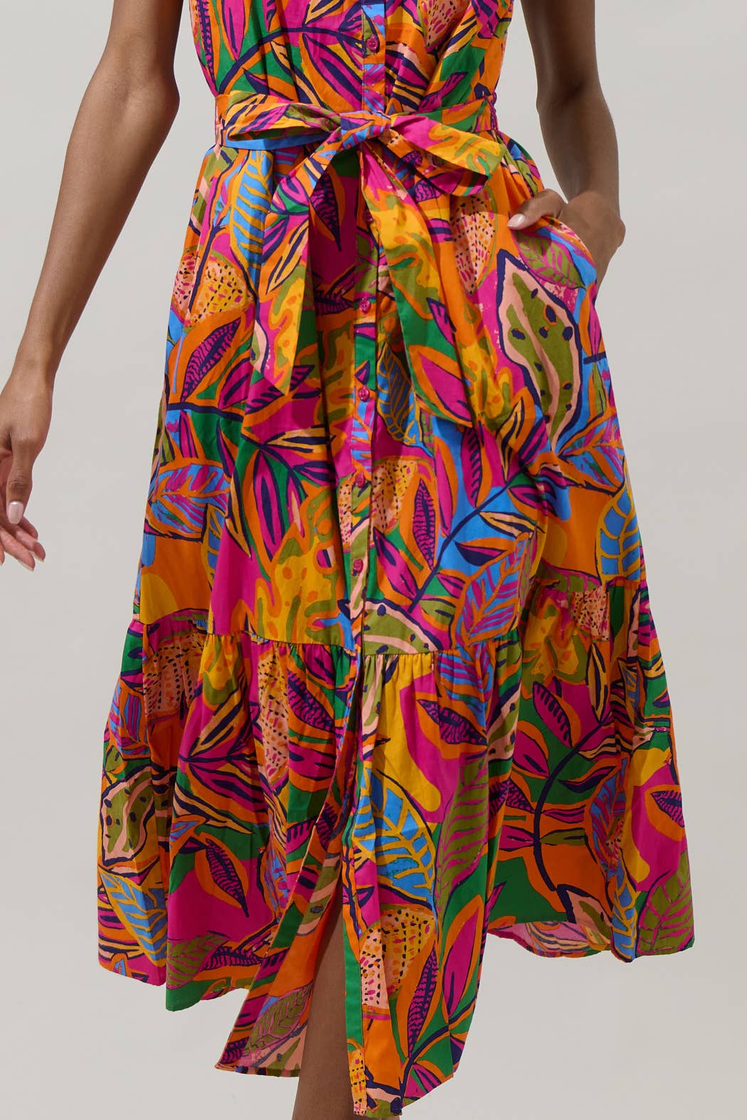 Set off a fashion explosion with the Floral Dynamite Midi Dress! This playful dress has a split neckline, flare bodice, and belted waist, making it perfect for any occasion. Breathable and with pockets, it's both stylish and practical. Pair with sandals and a crossbody bag for a fun look.