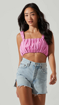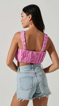 The Pink Bubble Top offers a sophisticated aesthetic, thanks to its square neckline, ruched front, and cropped hem. It features ruched shoulder straps while the back button closures and pull-on style add convenience. Paired with the matching Pink Bubble Shorts, this top is sure to be a fashionable addition to your wardrobe. Crafted with 100% Lyocell and 100% Rayon, dry clean only for best care results.