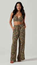 Explore with ease in the Tropical Getaway Pants. Crafted with 100% viscose and a lined rayon blend, they feature an abstract print and a high waist with a front tie accent. Contrast stitched side flap pockets and wide leg bottoms add to the relaxed fit. Wear them with the matching Tropical Getaway Top and set off on your next getaway with style. Dry clean only.