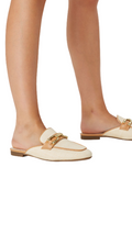 Expertly crafted using high-quality materials, Vanilla Mules offer a sleek and stylish look for any occasion. Featuring a flat rubber sole and closed almond toe, these mules provide comfortable support while walking. The chain and link detailing on the toe, along with the contrast trim, add a touch of sophistication. With a convenient front pull tab, these mules are easy to slip on and off. The synthetic upper, lining, and outsole ensure durability and long-lasting wear.