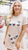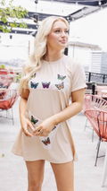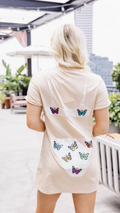 Elevate your beach day look with this white butterfly bikini cover up. Featuring a tan fabric accented with eye-catching sequence detail, you'll make a unique statement while enjoying sun protection. Perfect for a stylish and comfortable day out.